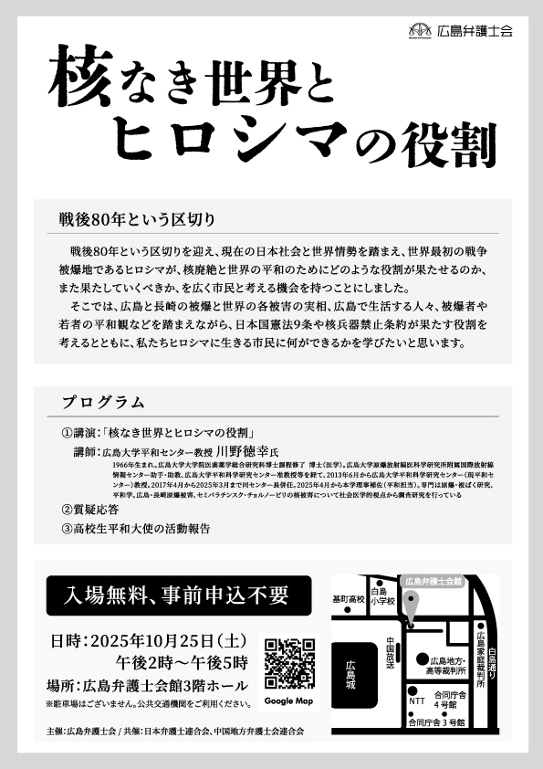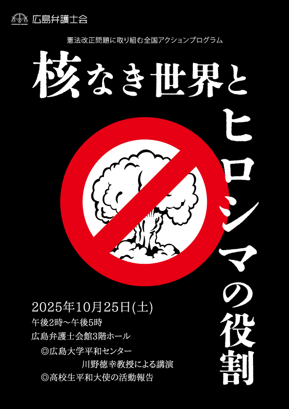 戦後80年という区切りを迎えた今年、現在の日本社会と世界情勢を踏まえ、世界最初の戦争被爆地であるヒロシマが、核廃絶と世界の平和のためにどのような役割が果たせるのか、また果たしていくべきか、を広く市民の皆さまと考えたいと思います。 日本国憲法9条や核兵器禁止条約が果たす役割や、被爆者や若者など、広島で生活する人々の平和観もふまえながら、ヒロシマの役割と私たちヒロシマに生きる市民の役割を考えるために企画しました。 皆さま、奮ってご参加ください。