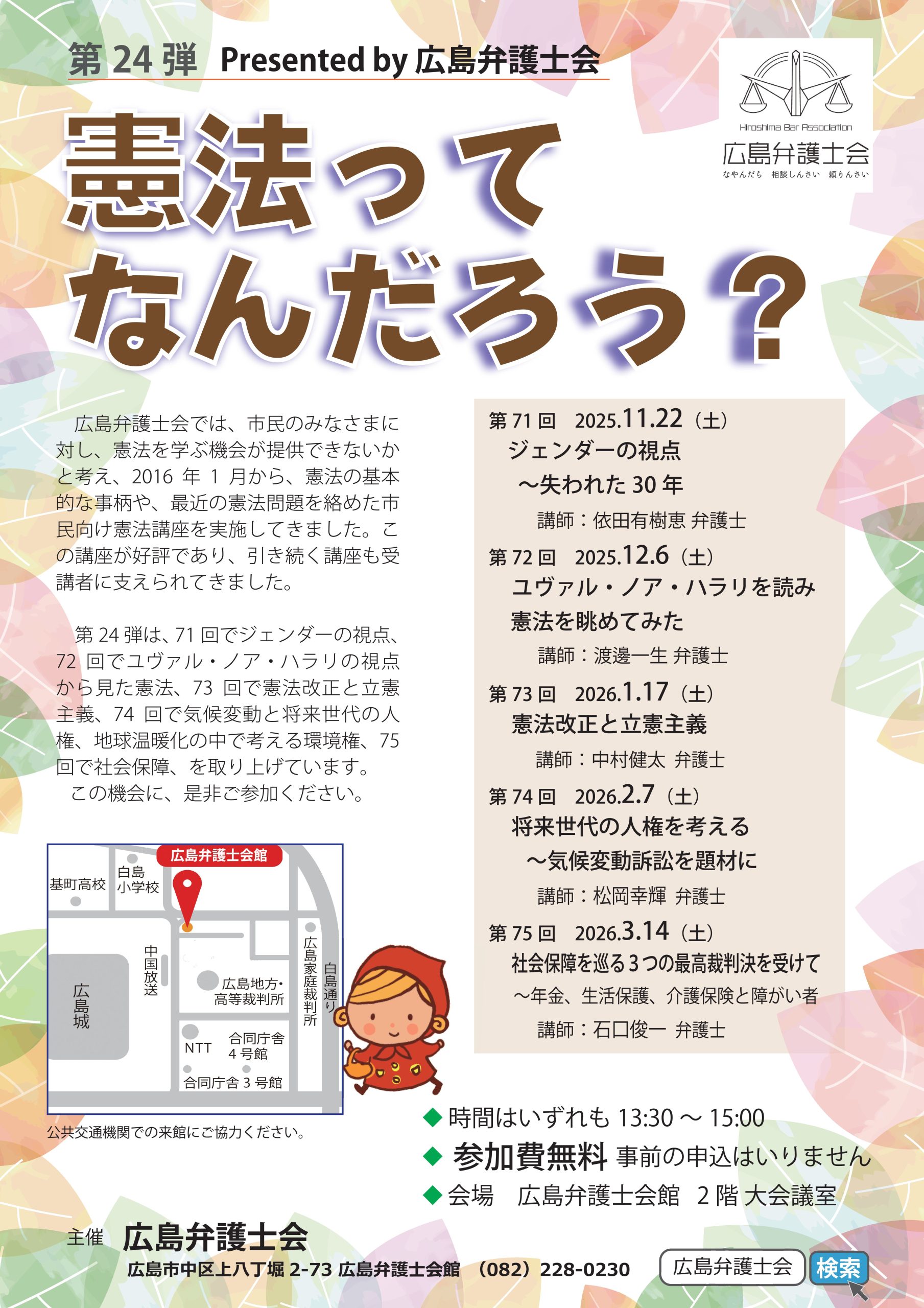 日時 | いずれも13:30~15:00 広島弁護士会館にて 憲法講座第71回 2025年11月22日(土) ジェンダーの視点~失われた30年 講師:依田有樹恵 弁護士 憲法講座第72回 2025年12月6日(土) ユヴァル・ノア・ハラリを読み憲法を眺めてみた 講師:渡邉一生 弁護士 憲法講座第73回 2026年1月17日(土) 憲法改正と立憲主義 講師:中村健太 弁護士 憲法講座第74回 2026年2月7日(土) 将来世代の人権を考える~気候変動訴訟を題材に 講師:松岡幸輝 弁護士 憲法講座第75回 2026年3月14日(土) 社会保障を巡る3つの最高裁判決を受けて~年金、生活保護、介護保険と障がい者 講師:石口俊一 弁護士 |