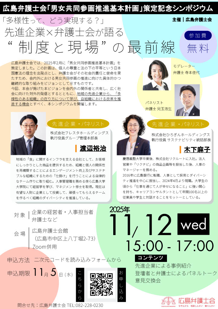 | 広島弁護士会は、2025年2月に「男女共同参画推進基本計画」を策定しました。本計画は、個人の尊重と法の下の平等という憲法の理念を基盤に、弁護士会として男女共同参画を実効的に推進するための指針を示すものです。
