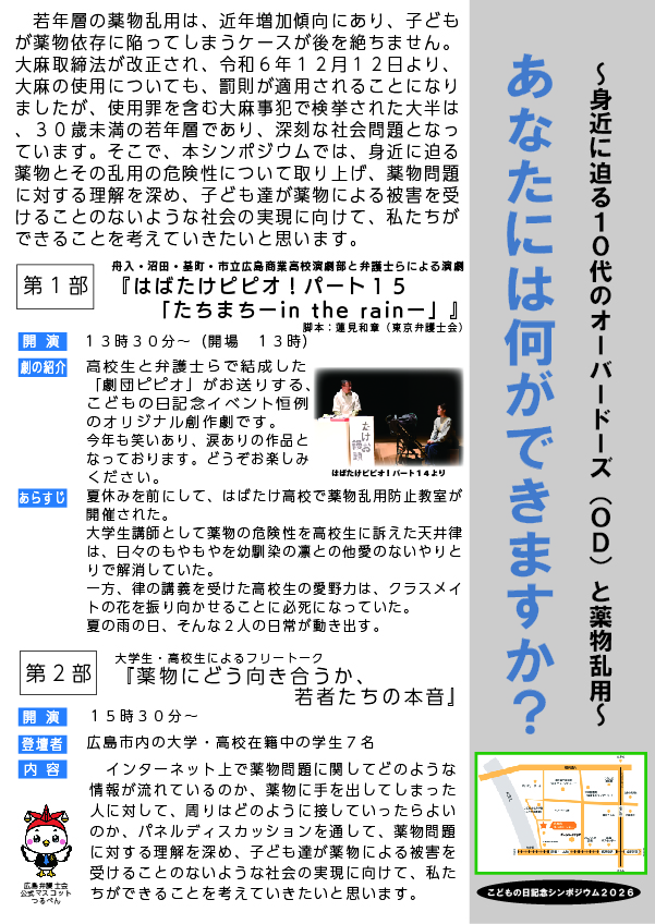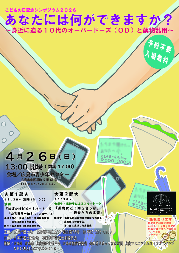 | 【こどもの日記念シンポジウム2026】 「あなたには何ができますか?~身近に迫る10代オーバードーズ(OD)と薬物乱用~」 4月26日午後1時30分から、薬物乱用防止をテーマに、シンポジウム「あなたには何ができますか?~身近に迫る10代オーバードーズ(OD)と薬物乱用~」を開催します。 第1部では、高校生と弁護士らにより結成された劇団ピピオによる演劇、はばたけピピオ!パート15「たちまち – in the rain -」を、第2部では、広島市内の大学・高校に在籍中の学生によるフリートーク「薬物にどう向き合うか、若者たちの本音」を行います。 薬物乱用防止のあり方について、皆様で一緒に考えていけたらと思います。広島市青少年センターにて皆様をお待ちしております! ※参加無料・事前申込み不要です。 ※託児もございますので、4月17日(金)までに広島弁護士会にご連絡ください。 また、本シンポジウム開催に先立ち、昨年開催されましたこどもの日記念シンポジウム2025「子ども虐待防止のための親の支援~理想の親、現実の私」第1部「ねんねこのうた」を期間限定(2026年4月26日まで)で配信いたします。こちらも是非ご覧ください。URL:https://www.youtube.com/watch?v=oRdRi14-jDU |