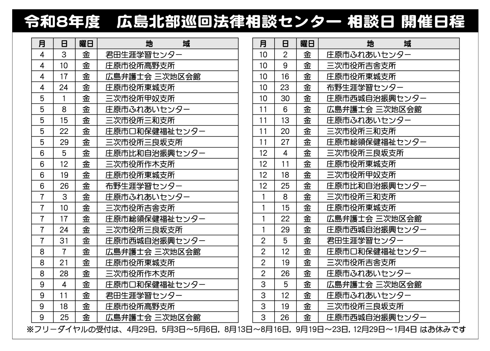 相談は、三次市内と庄原市内を巡回して行っています。今年度の相談日程、担当弁護士、担当地域はこちらの日程表をご覧下さい。なお、相談場所・担当弁護士は変更する可能性がありますので、詳しくは、予約電話の際にご案内致します。